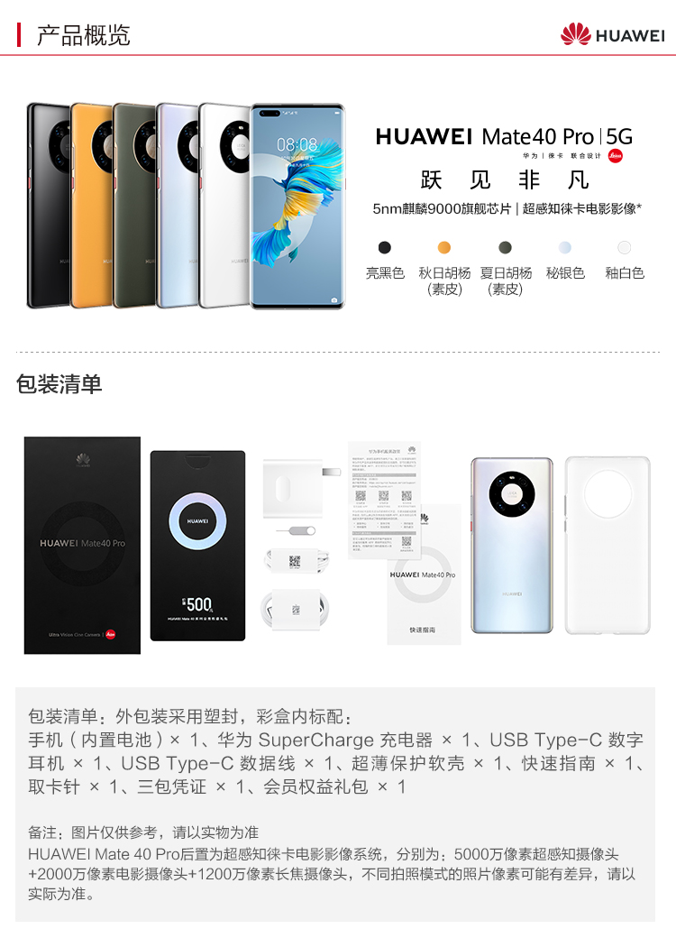 商品名称:华为 HUAWEI Mate 40 Pro麒麟9000 SoC芯片 超感知徕卡电影影像 有线无线双超级快充8GB+256GB秘银色5G全网通